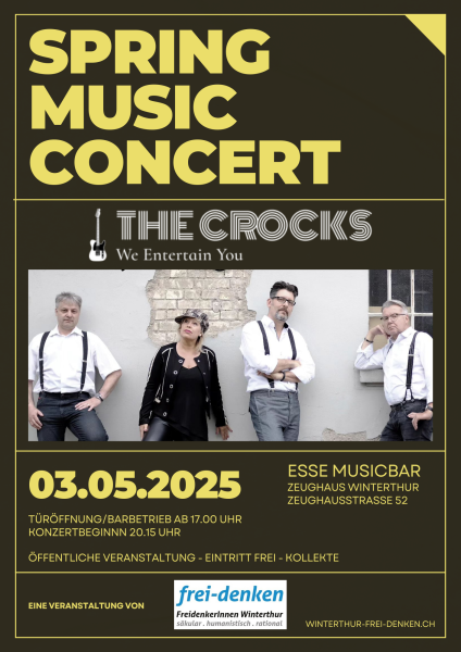 Winterthur Spring Music Concert - The Crocks 03. Mag 2025 20:15 Calendar iCal download ESSE Music Bar, Zeughausstrasse 52, 8400 Winterthur Türöffnung/Barbetrieb ab 17.00 Uhr Konzertbeginn 20.15 Uhr Öffentliche Veranstaltung - Eintritt frei - Kollekte Eine Veranstaltung der Freidenkenden Winterthur winterthur-frei-denken.ch
